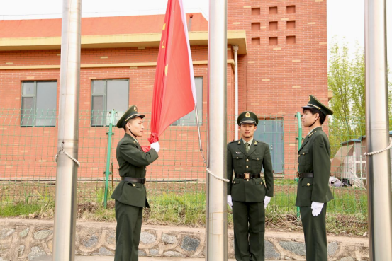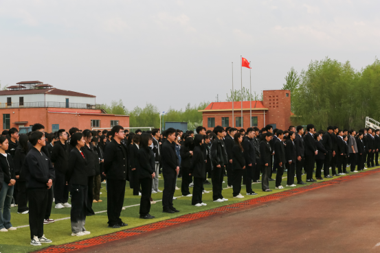 旗手赵晨然、护旗手姜岩松及辛宏驰同学,以庄重的姿态护卫着鲜艳的五星红旗。在庄严的国歌声中,五星红旗冉冉升起,全体师生肃立行注目礼,表达对祖国的敬仰与热爱。这一庄严时刻,爱国情感在每个人的心中激荡,激励全体师生为实现中华民族伟大复兴的中国梦而努力奋斗。