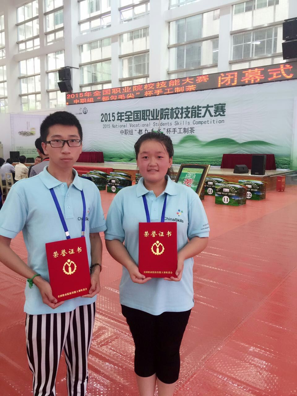 2015年全国职业院校员工技能大赛中王宇婷、李犇荣获手工制茶赛项二等奖